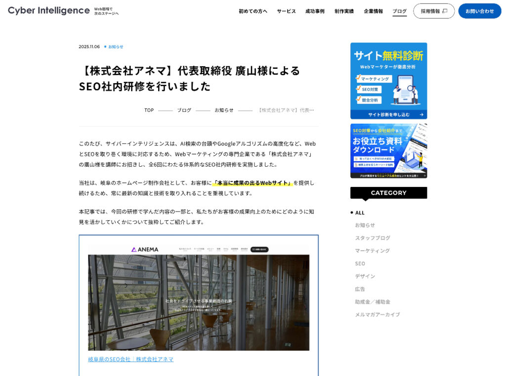 製造業のホームページ制作に強みを持つサイバーインテリジェンス社は、弊社廣山によるSEOコンサルティングの様子も公開してくださっています。