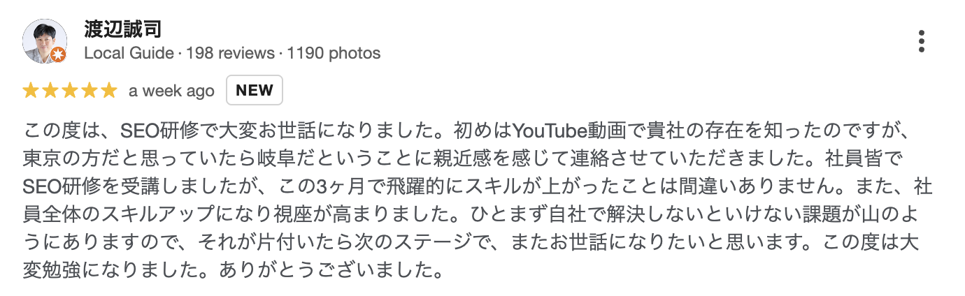 - この度は、SEO研修で大変お世話になりました。初めはYouTube動画で貴社の存在を知ったのですが、東京の方だと思っていたら岐阜だということに親近感を感じて連絡させていただきました。社員皆でSEO研修を受講しましたが、この3ヶ月で飛躍的にスキルが上がったことは間違いありません。また、社員全体のスキルアップになり視座が高まりました。ひとまず自社で解決しないといけない課題が山のようにありますので、それが片付いたら次のステージで、またお世話になりたいと思います。この度は大変勉強になりました。ありがとうございました。